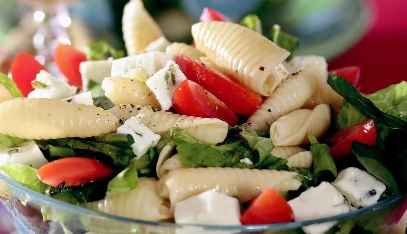 Makarnayı tuzlu suda haşlayıp süzün. Tereyağını bir tavaya alıp makarnayı 1-2 dakika sote edin. Peyniri küp kesin. Domatesleri dilimleyin. Marul ve roka yapraklarını irice kıyın. Makarnayı servis tabağına alıp ılıtın. Daha sonra üzerine domates, peynir, roka ve marul yapraklarını ilave edin. Sosu hazırlamak için, zeytinyağı, sirke, limon suyu ve tuzu ayrı bir kapta karıştırın. Salatanın üzerine gezdirip harmanladıktan sonra servis yapın.
