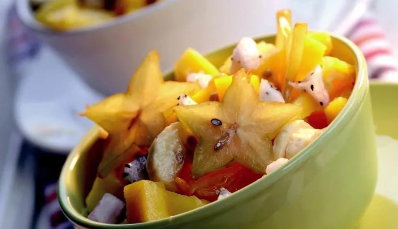 Mango, portakal, liçi ve ananası temizleyerek, doğrayıp salata kasesine alın. Harmanlayarak bir gece buzdolabında dinlendirin. Dolaptan aldığınızda, üzerine limon suyunu gezdirin. Dilimlenmiş muz ve pitahayayı yerleştirin. Karambola ile süsleyerek servis yapın.