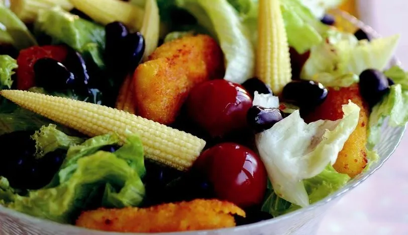 Göbek salatayı yapraklarına ayırın. Tavuk kroketleri sıvı yağda arkalı-önlü kızartın. Bebek mısırları tuzlu suda 10-15 dakika haşlayın. Tüm malzemeyi salata kasesine alıp, harmanlayın. Sosu hazırlamak için limon suyu, zeytinyağı ve tuzu karıştırın. Salatanın üzerine gezdirip, servis yapın.