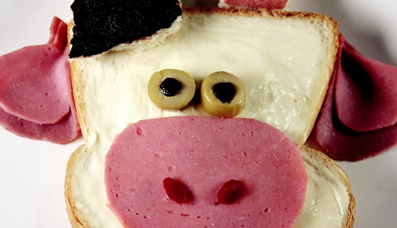 Ekmeklerden birine eritme peyniri sürün. Jambondan ağız kısmını oluşturun. İnce kıyılmış biberden burun deliklerini yapın. Diğer ekmekten boynuz kısımlarını kesin ve üzerlerine labne sürüp ineğin kafasına kürdanla takın.
