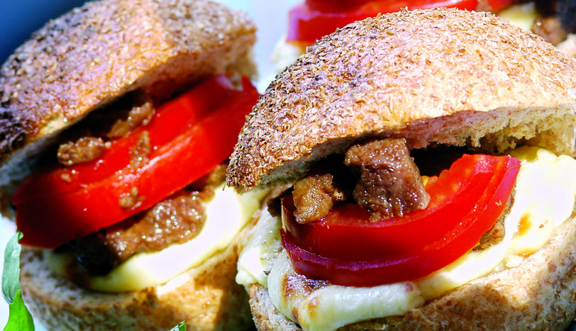 Kavurmayı pul biberle harmanlayın. Pul biberli kavurmayı sandviçlerin içine paylaştırın. Önceden ısıtılmış 200 derece fırında 2-3 dakika bekletin. Sandviçleri fırından çıkartıp, domates dilimlerini yerleştirerek sıcak olarak servis yapın.