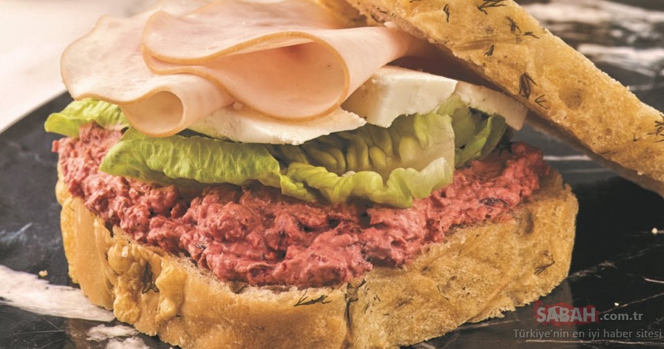 2 6 dilim ekmeğin üzerine 2'şer çorba kaşığı pancarlı sos sürün. 2'şer adet marul yaprağı, 2'şer dilim tulum peyniri ile hindi füme yerleştirin. Diğer ekmek parçalarını üzerilerine koyup servis yapın.