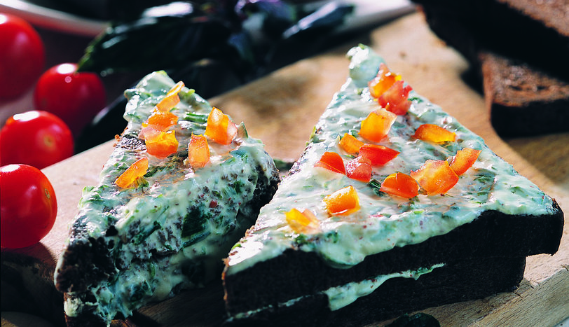 Kırmızı dolmalık biber ve taze soğanların yeşil saplarını blendırdan geçirin. Bu karışıma nane ekleyip, harmanlayın. Sebzeleri yoğurda ekleyip, bir çatalla iyice karıştırın. Kepek ekmeklerini üçgen olacak şekilde ortadan ikiye kesin.