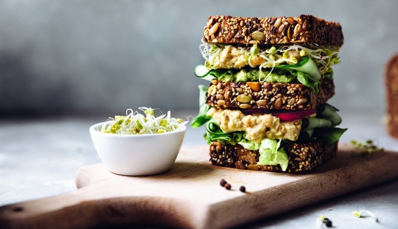 Dört parça ekmek diliminin üzerine sırasıyla avokado sos, kıvırcık marul yaprağı, kabak dilimleri, nohutlu sos ve soya filizi sıralamasıyla malzemeleri dizin. Üzerlerine diğer ekmek dilimlerini yerleştirip servis yapın.