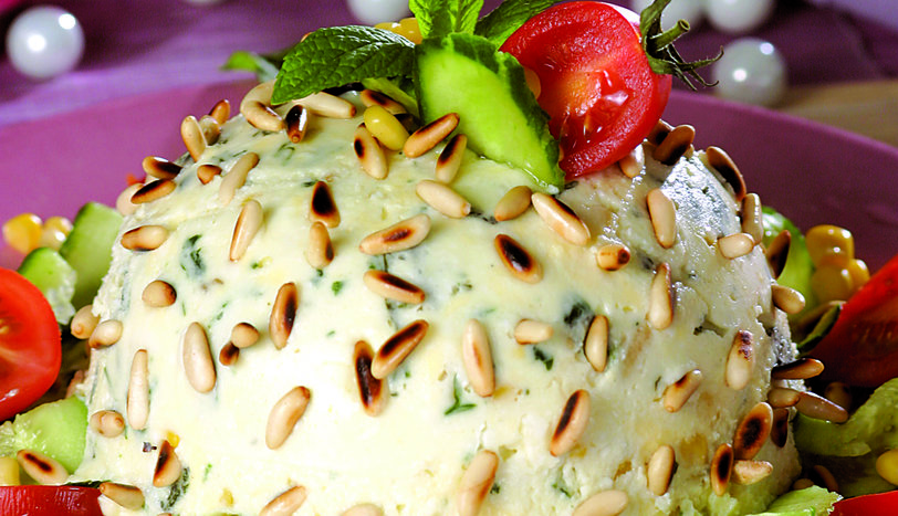 Fesleğenleri ve fıstıkların yarısını da ilave edip iyice karıştırın. Orta boy yuvarlak cam bir kabı soğuk sudan geçirin ve peynirli karışımı bunun içine boşaltıp üzerini düzeltin. Kabı buzdolabında 3-4 saat beklettikten sonra bir servis tabağına ters çevirin. Üzerine kalan fıstıkları serpin.