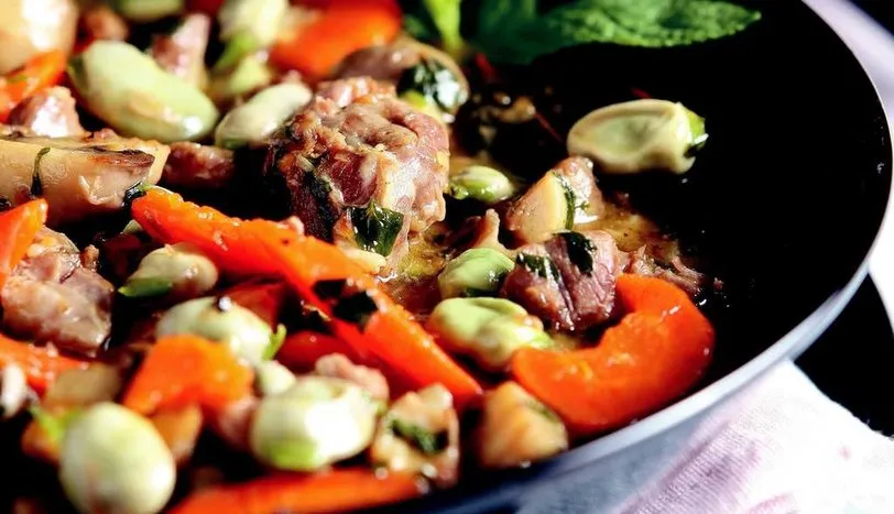 BİR tencerede 3 çorba kaşığı tereyağını eritip eti kavurun. Üzerine, soyulmuş bütün soğan, defne yaprağı, karabiber, tuz ve et suyu ilave edin. Tencerenin kapağını kapatıp kısık ateşte 45 dakika pişirin. Sürenin sonunda temizleyip verev doğradığınız havuçları ve iç baklayı tencereye ekleyin. 25 dakika daha pişirip soğanı tencereden alın. Diğer taraftan mantarları temizleyip ince doğrayın ve 1 çorba kaşığı tereyağında sote edin. Kıyılmış maydanoz ekleyip kenara alın. 6 çorba kaşığı patates püresi tozunu baklanın üzerine serpip karıştırın. Yemeği bir taşım daha pişirip mantarları ilave edin. Muskatla tatlandırıp bir-iki dakika daha pişirin ve ocaktan alın.