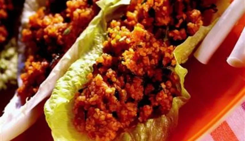 BİR kaseye ince bulguru alın ve üzerine kaynar su dökün. Suyunu çekip, şişmesi için ağzını bir kapakla kapatın. Suyunu çektikten sonra içine zeytinyağı, nar ekşisi, biber ve domates salçası, limonsuyu, pulbiber, tuz ilave edip yoğurun. İnce kıyılmış taze soğan ve maydanozu ekleyip, karıştırın. Marul yapraklarının içine pay edip servis yapın.