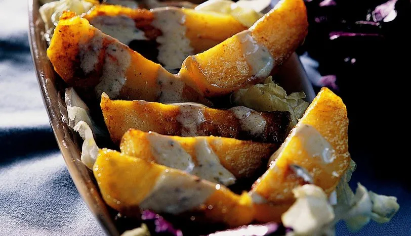 Patatesleri yarı yarıya haşlayın. Kabuklarını soyup dörde bölün. Fırın tepsisine dizin. Diğer tarafta köri, ezilmiş sarmısak ve zeytinyağını karıştırın. Patateslerin üzerine gezdirin. Yarım saat bekletin. Arada bir karıştırarak, patateslerin sosu iyice emmesini sağlayın. Önceden ısıtılmış 180 derece fırında pişirin. Sos için fesleğeni incecik kıyıp, yoğurtla karıştırın. Servis tabağına kıyılmış marulları yayın. Fırından çıkardığınız patatesleri marulların üzerine dizin. Fesleğen sosu gezdirip servis yapın.