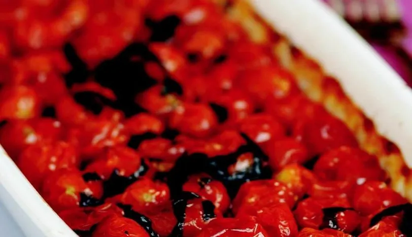 DOMATESLERİ yıkadıktan sonra, varsa saplarını koparıp fırın kabına dizin. Önemli olan domateslerin üst üste olmamaları, fırın kabının abanını kaplamalarıdır. İncecik kıyılmış taze fesleğen yaprakları, ezilmiş sarmısak, tuz ve zeytinyağını bir kapta çatalla iyice karıştırıp, domateslerin üzerine dökün. Elinizle harmanlayarak malzemenin tüm domateslere bulaşmasını sağlayın ve önceden ısınmış 180 derecel fırında 25 dakika pişirin.