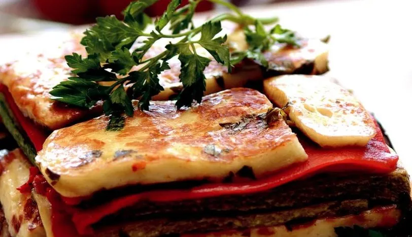 PATLICAN ve kabakları uzunlamasına ince dilimleyin. Patlıcanların acısını almak için, tuzlu suda 10 dakika bekletin. Sudan geçirip iyice kurulayın. Biberleri ikiye bölüp çekirdeklerini çıkarın. Yapışmaz yüzeyli bir tavaya çok az sıvıyağ koyun. Yağ azaldıkça ekleyerek patlıcan, kabak ve kırmızı biberleri arkalı önlü kızartın. Biberlerin kabuklarını soyun. Sebzelere tuz serpin. Hellim peynirini dilimleyin. Ayrı bir tavaya çok az sıvıyağ koyup arkalı önlü kızartın. Küçük kare bir fırın kabını yağlayın. En alta bir kat peynir dizin. Üzerine kıyılmış maydanoz serpin. Patlıcan, kabak ve biberi birer kat koyun. Aralarına maydanoz serpin. Yeniden bir sıra peynir koyun. En üstte peynir olacak şekilde elinizdeki sebze ve peynir bitene kadar aynı işleme devam edin. Önceden ısıtılmış 180 derece fırında 10 dakika pişirin. Yemeği servis tabağına ters çevirerek çıkarın. Sıcak olarak servis yapın.