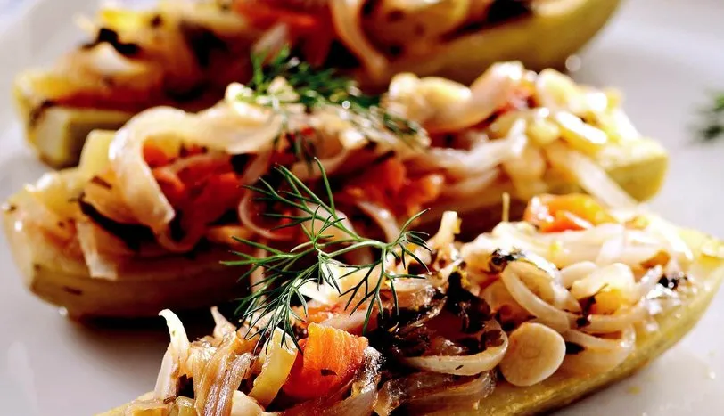 KABAKLARI yıkayıp kabak soyacağının tırtıklı tarafı ile kazıyarak temizleyin. Daha sonra boylamasına ikiye bölün ve içleriniboşaltın. Hafifçe tuzlayıp kenara alın. Piyazlık doğradığınız soğanları zeytinyağında renkleri dönene dek kavurun. Üzerine kabukları soyulduktan sona küp doğranmış domates ve ezilmiş bütün sarmısakları ilave edin. Tuz ve şekeri ekleyip 5 dakika soteedin. Kabakları yayvan bir tencereye dizin. Harcı içlerine paylaştırın. Dereotunu ince kıyıp kabaklara serpin. Suyu tencereye ekleyin. Tencerenin kapağını kapatıp 30-35 dakika pişirin. Soğuk servis yapın.