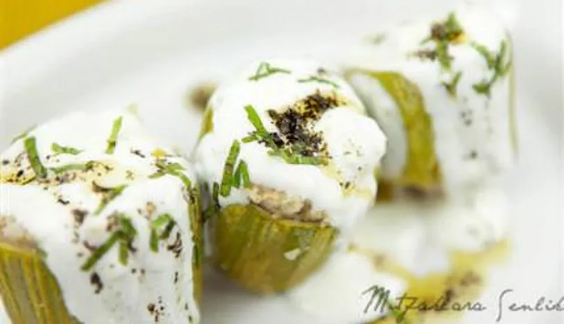 Pişen kabaklı köfteleri, yayvan bir tabağa alıyoruz, uzerine sarımsaklı yoğurt ve tereyağli nane ekleyip servis yapabililirsiniz.