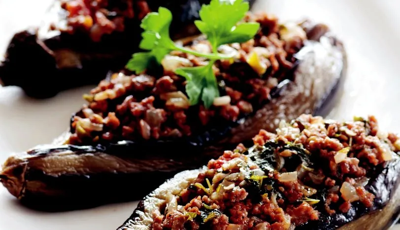 PATLICANLARI alacalı soyun. Elinizi zeytinyağına batırarak her tarafını yağlayın. Bir tepsiye koyun ve fırının ızgara ayarında, ara sıra çevirerek rengi dönene dek közleyin. Diğer taraftan tereyağını bir tavaya alıp yemeklik doğranmış soğanı rengi dönene dek kavurun. Üzerine kıymayı ekleyin ve suyunu salıp çekene dek karıştırarak kavurun. İnce kıyılmış sarmısak ve biberi ekleyin. Birkaç dakika kavurduktan sonra kabukları soyulup küp doğranmış domatesi harca katın. Tuzunu ve karabiberini ayarlayın. Domates yumuşayanadek ara sıra karıştırarak pişirin. Kıyılmış maydanozu katıp karıştırın. Patlıcanları tencereye alıp ortalarını bıçakla hafifçe açın. Harcı içlerine paylaştırın. 2 su bardağı sıcak su ve bir tutam tuzu tencereye ekleyin. Tencerenin kapağını kapatıp, orta ateşte 30 dakika pişirin.