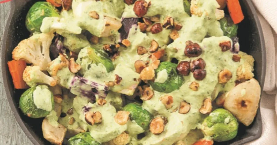 Pesto sos için dolmalık fıstığı yapışmaz yüzeyli bir tavaya alıp orta ateşte rengi hafifçe dönene dek kavurun. Fesleğenleri yıkayıp yapraklarına ayıkladıktan sonra iyice kurulayın. Daha sonra tüm pesto sos malzemesini mutfak robotuna aktarın.Tamamen püre haline gelene kadar çekip kenara alın. Sebzeleri yıkayıp kurulayın. Kereviz, yerelması ve havuçları soyup eşit büyüklüklerde doğrayın. Pişirme kağıdı serilmiş bir fırın tepsine yerleştirin ve önceden ısıtılmış 200 derece fırında 10 dakika hafif yumuşayana kadar pişirin. Diğer taraftan fındığı kalın tabanlı bir tavaya alıp 1-2 dakika yağı çıkana kadar kavurun. Üzerine zeytinyağını ekleyin ve ısındıktan sonra Brüksel lahanalarını ilave edin. Tavayı öne arkaya sallayarak her taraflarının pişmesini sağlayın. Fırınladığınız sebzeleri de tavaya ekleyip, sebzeler yumuşayana kadar kavurun. Servis tabağına aktarın. Sıcakken üzerine labneli pesto sos gezdirip servis yapın.