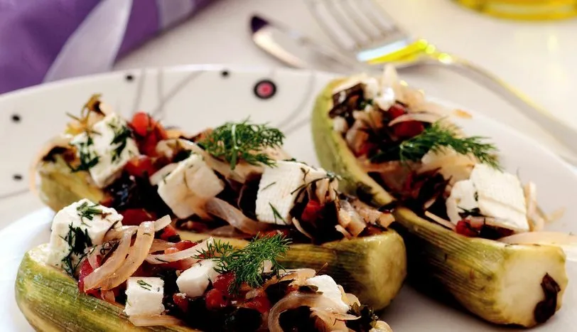 1 KABAKLARI karnıyarık yapar gibi temizleyin. Soğanları piyazlık doğrayıp bir kaba alın. Üzerine kabukları soyulup, küp doğranmış domates, dereotu, maydanoz, sarmısak, tozşeker, tuz ve karabiber ekleyip, harmanlayın. Kabakları Düdüklü Tencere'ye yerleştirin ve hazırladığınız harcı içlerine