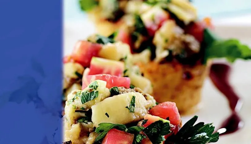 PATATESLERİN kabuklarını soyduktan sonra rendeleyin. Elinizle suyunu sıkın ve bir kaba alın. İçine yumurta, kaşar peyniri, eritilmiş tereyağı, tuz ve karabiber ilave edip, karıştırın. Harçtan limon büyüklüğünde parçalarkoparın. Elinizle çanak şekli vererek, muffin kalıplarının içine yerleştirin. Önceden ısıtılmış 200 derece fırında 20-25 dakika pişirin. Üzeri için patlıcanları közleyin ve kabuklarını soyup, iri küpler halinde doğrayın. İçine kabukları soyulup, iri doğranmış domates, zeytinyağı, limon suyu, kıyılmış maydanoz ve tuz ekleyip, karıştırın. Pişen patatesler ılındıktan sonra kalıptan çıkarın ve servis tabağına alın. Üzerine patlıcan karışımını paylaştırın ve maydanozla süsleyerek, servis yapın.
