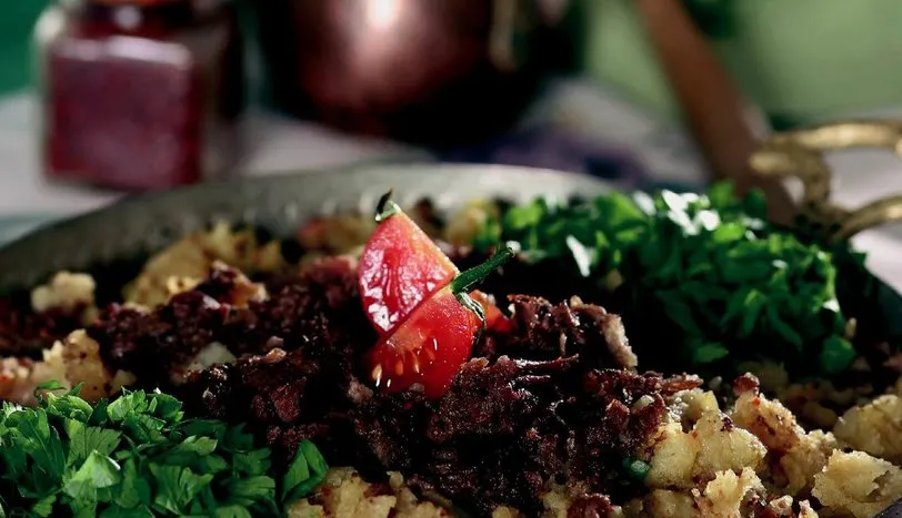 Haşlanmış patatesleri çatalla ezin. Tereyağında piyazlık doğranmış soğanları rengi dönene kadar kavurun. Patatesi ilave edip soğanla iyice karışana kadar kavurmaya devam edin. Tuz ve karabiber ekleyin. Patates mıhlamasını servis tabağına alıp ortasına doğranmış kavurmayı koyun. Kıyılmış maydanoz ve pulbiberle süsleyip servis yapın.