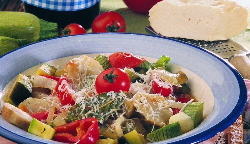 Tüm sebzeleri yıkayın. Patlıcanların kabuklarını alacalı soyup küp doğrayın. Kabağın ve domatesin de kabuğunu soyup küp doğrayın. Dolmalık biberi ve yerelmasını halka halka dilimleyin. Soğanı piyazlık doğrayın. Zeytinyağı ve soğanı bir tencereye alın. Doğradığınız sebzeleri de ekleyip, karıştırarak kavurun. Su, ince kıyılmış sarmısak, defne yaprağı, tuz ve karabiberi ekleyin. Tencerenin kapağını kapatıp, sebzeler suyunu bırakıp çekene kadar pişirin. Servis tabağına alıp, üzerine rendelenmiş beyaz peyniri serpin.