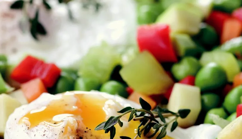 KABAK, havuç ve biberleri temizledikten sonra küp şeklinde doğrayın. Bezelye dahil bütün sebzeleri ayrıayrı haşlayın ve süzün. Zeytinyağını bir tavaya alıp, sebzeleri ekleyin ve 1-2 dakika çevirin. Suyu bir tencereyealın ve kaynatın. Yumurtayı kırın ve pişince kevgir yardımıyla servis tabağına alın. Diğer yumurtaları daaynı şekilde pişirin. Tuz ve karabiber serpin. Haşlanmış sebzelerle birlikte servis yapın.