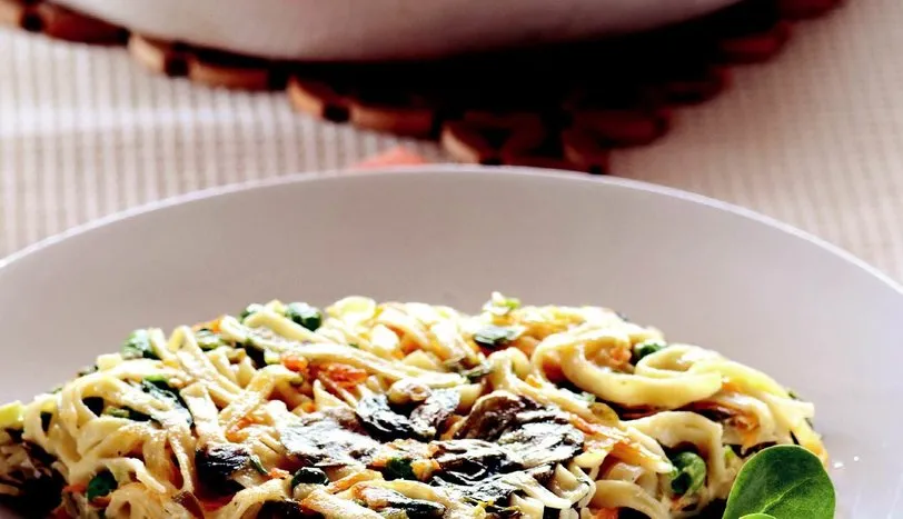 MAKARNAYI tuz eklediğiniz bol suda haşlayıp, süzün. Geniş bir kaba alıp buzdolabında 10-15 dakika bekletin. Yumurta aklarını tuz ve karabiberle iyice çırpın. Makarnanın üzerine iri kıyılmış semizotu, rendelenmiş havuç, ince kıyılmış taze soğan, bezelye, çırpılmış yumurta akı ve 2 çorba kaşığı zeytinyağı ilave edin. Büyük bir tavayı kalan zeytinyağı ile yağlayın ve kızdırın. Makarnalı karışımı tavaya düzgünce yayın ve üzerini düzeltin. Her iki tarafını da pişirin. Servis tabağına aktarın ve dilimleyerek servis yapın.