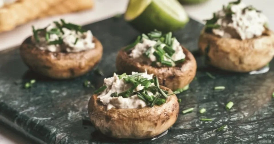 Tavuk butlarını iyice yıkayıp kurulayın. Tereyağını orta boy bir çelik tencereye alıp kızdırın ve tavukları ekleyin. Üzerine lime kabuğu, kekik ve kabukları soyulmuş bütün sarımsak ekleyip en az 7-8 dakika karıştırmadan pişirerek mühürleyin. Diğer taraflarını çevirip 7-8 dakika aynı şekilde pişirin. Daha sonra tencereyi ocağın en küçük gözüne aktarın ve kremayı ekleyin. Kısık ateşte tencerenin kapağı kapalı olarak 40-45 dakika, tavuk iyice yumuşayana kadar pişirin. Mantarları limonla ovduktan sonra ince dilimleyin ve tencereye ilave edin. Kısık ateşte mantar yumuşayana kadar pişirin ve püre kıvamına gelene kadar blenderden geçirin. Hafif ılınan karışıma taze peynir ekleyip homojen bir kıvam alana kadar yeniden blenderden geçirin. Buzdolabına alıp en az 2-3 saat bekletin. Servis için mantarların saplarını koparıp temizleyin. İzli bir döküm tavayı zeytinyağı ile yağlayın. Mantarları tavaya alıp, yüksek ateşte pişirin. İçlerine tavuklu mantar ezmesi koyun. Kıyılmış frenk soğanı ekleyerek servis yapın.