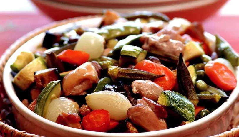 TÜM sebzeleri temizleyin. Taze fasulye, havuç, kabak ve patlıcanı çok iri olmayacak şekilde doğrayın. Patlıcanların acısını almak için tuzlu suda 15 dakika bekletin. Sıvıyağı tencereye alıp, üzerine soğan, taze fasulye, havuç ve barbunyayı ilave ederek sote yapın. Sebzeler yarı yarıya yumuşadığında tavuğu ilave edin. Tavuk kavrulunca salça ve bezelyeyi katın. Birkaç dakika kavurup suyunu ekleyin. Sebzeler suyu yarı yarıya çekince kabak, patlıcan ve bamyayı ilave edin. Tuzunu ayarlayın. Patlıcanlar yumuşayana kadar pişirip ocaktan alın ve bir fırın kabına aktarın. Önceden ısıtılmış 180 derece fırında 15-20 dakika pişirip servis yapın.