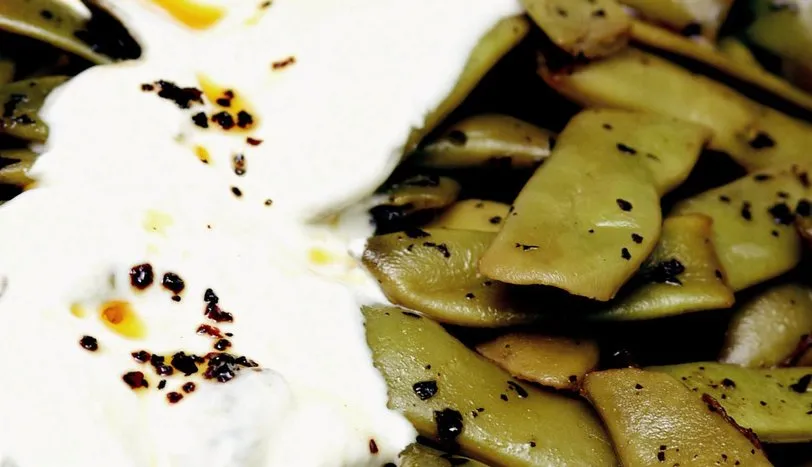 İLK olarak taze fasulyeleri, yapışmaz yüzeyli tavada biraz soteleyin. Ardından 2 çorba kaşığı zeytinyağını ekleyerek kavurmaya devam edin. Tava ısındığında, reyhanı avucunuzda ovalayarak ve karıştırarak tencereye ekleyin. Yaklaşık 10 dakika kavurmaya devam nedin. En son kıyılmış sarmısakları ekleyip, yemeği servis tabağına alın ve nüzerine sarmısaklı yoğurt dökün. Ayrı bir kapta tereyağını kızdırıp, içine pulbiber atın. Sarmısaklı yoğurdun üzerine gezdirin