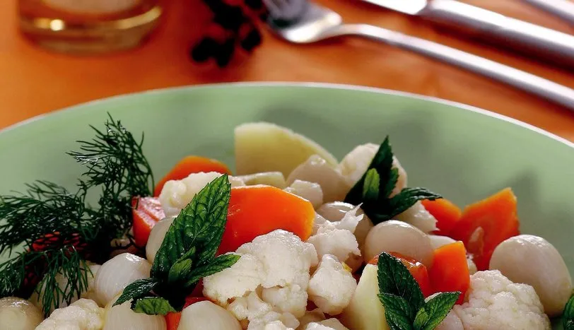 SOĞANLARI soyup zeytinyağında bütün olarak 5 dakika sote edin. Havuç ve patatesleri kuşbaşı doğrayın. Önce havuçları sonra patatesleri soğanlara ekleyip 1-2 dakika daha soteleyin. Suyunu ilave ettikten sonra 10 dakika süreyle pişmeye bırakın. Diğer taraftan çiçeklerine ayırdığınız karnabaharları tuzlu ve sirkeli suda 10 dakika haşlayıp diğer sebzelere ekleyin. Kesmeşeker ve tuzu da üzerine ilave ederek 10 dakika daha pişirin. Ilındıktan sonra maydanoz ve dereotu ile süsleyerek servis yapın.