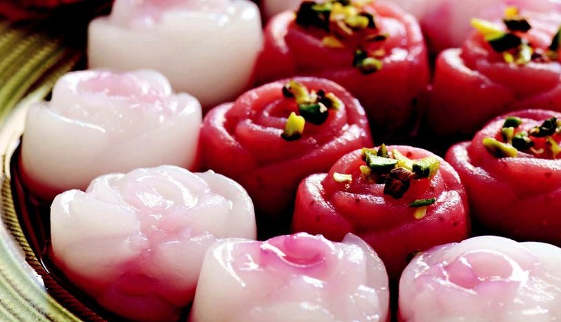 Şerbet için, yıkanmış gül yaprakları, şeker, su ve limon suyunu kavanoza koyup, 1 gün boyunca güneşte bekletin. Muhallebi için, su, nişasta ve şekeri tencerede devamlı karıştırarak kaynatın. Gül formunda silikon kalıplara döküp, en az 2 saat buzdolabında bekletin. Servis için şerbeti süzüp, kalıplardan çıkarılan muhallebinin üzerine dökün. Gül yaprakları ile servis yapın.