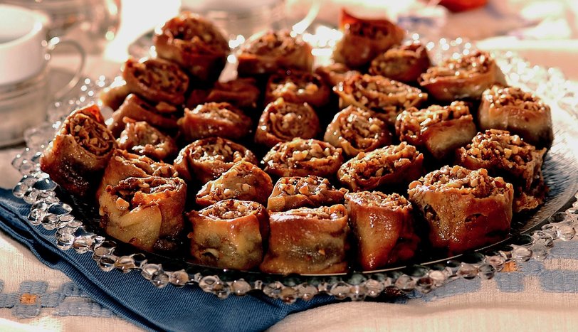Nişasta ya da un serperek baklava yufkası inceliğinde açın. Kenarlarını bıçakla keserek dikdörtgen haline getirin. Açtığınız hamurun kenarlarına yapışmasını sağlamak için yumurta akı sürün. Üzerine ceviz serpip alt ucundan yukarı doğru sararak rulo haline getirin. Rulo hamurdan iki parmak genişliğinde parçalar kesip dik olarak bir tepsiye dizin.
