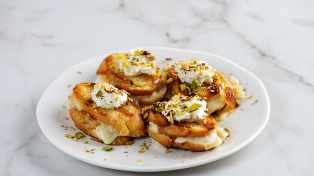 Üzerine dilimlenmiş dil peynirini ekleyip tekrar ekmekleri dizin ve kızarıncaya kadar pişirin. Pişmeye yakın ekmeklerin üzerine tereyağı sürün.