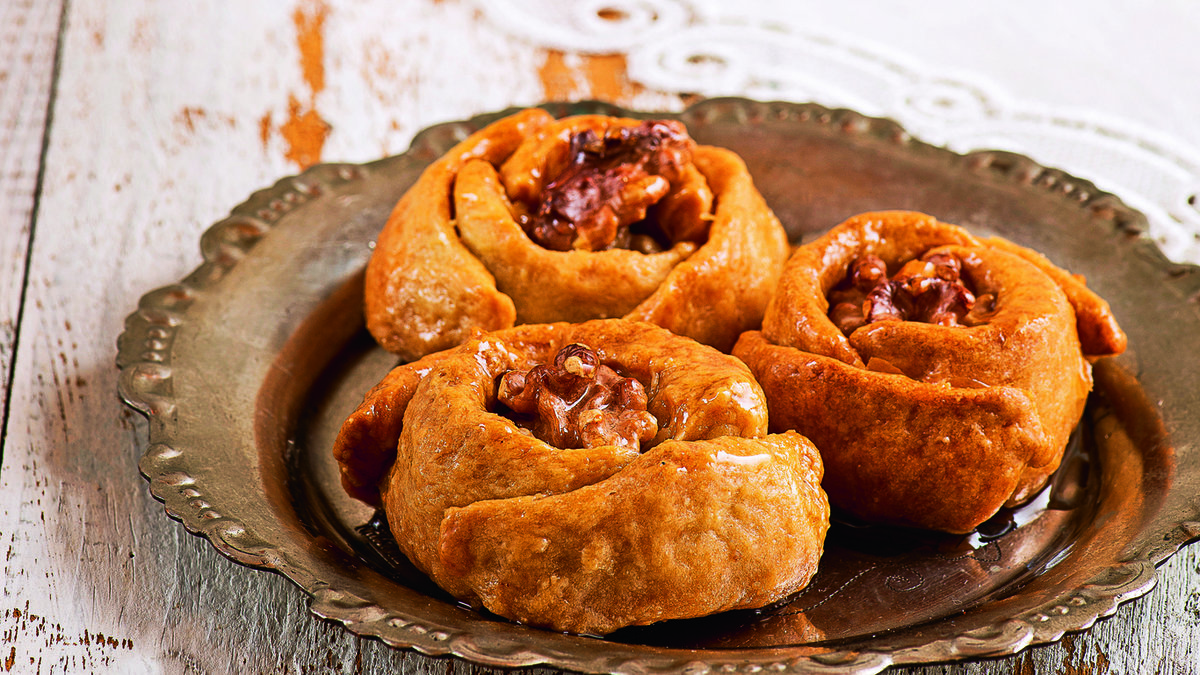 Dört adet minik hamur parçasını 6-7 cm uzunluğunda parçalar şeklinde hazırlayın. İki parçayı yarım cevizi saracak şekilde karşılıklı yerleştirin. Diğer iki parçayı da diğer iki hamurun kat yerlerini ortalayacak şekilde yerleştirin. Kalan hamur parçalarını aynı şekilde hazırlayıp tereyağı sürülmüş fırın tepsisine dizin.