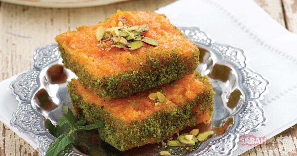 Kare cam bir kabı ıslatın. Tatlıyı içine boşaltıp soğutun. Dilimleyip kenarlarını toz antepfıstığına buladıktan sonra servis yapın.