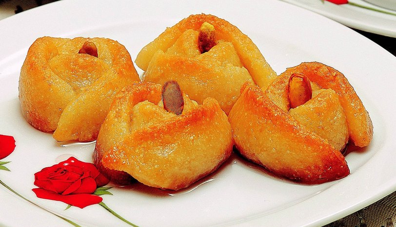 Önceden ısıtılmış 180 derece fırında, hamurlar pembeleşene kadar pişirin. Fırından çıkardığınız gül tatlısının üzerine soğuk şerbeti gezdirip, çekmesi için yarım saat bekletin. Tatlıların üzerine birer adet antep fıstığı yerleştirip servis yapın.