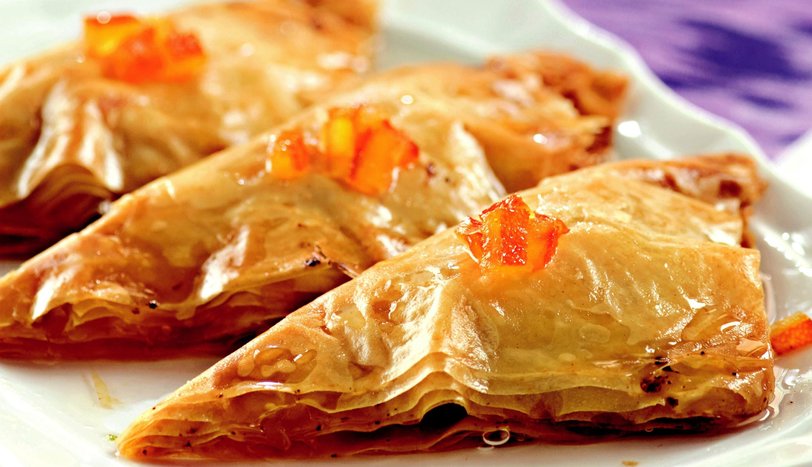 Karelerin ortasına iç harçtan 1'er yemek kaşığı koyun ve üçgen şeklinde kapatıp, üzerine tekrar tereyağı sürün. Diğer 6'lı yufka grubuna da aynı işlemi uygulayın ve yağlanmış fırın tepsisine dizin. Önceden ısıtılmış 190 derece fırında üzerleri hafif pembeleşene kadar pişirin.- 3