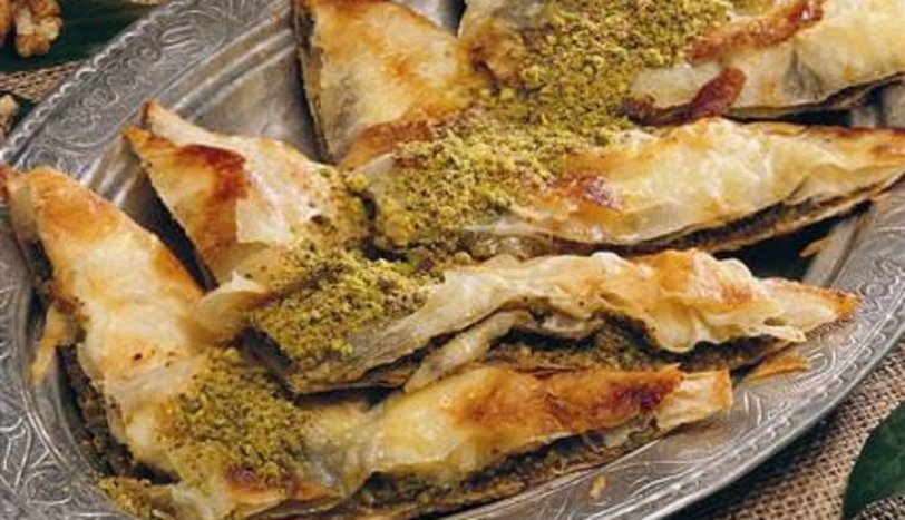 Yufkayı düz bir zeminde açın. Tereyağını eriterek yufkayı yağlayın (bir kısmını üzerine sürmek için ayırın). Kaymağı parçalar halinde serpiştirin. Üzerine şeker ve fıstığı ekleyin. Yufkayı bohça şeklinde katlayın. Yapışmaz tavada, yağ kullanmadan, altı ve üstü kızarana dek pişirin. Üzerine kalan tereyağını sürüp, üçgen dilimler halinde keserek servis yapın.