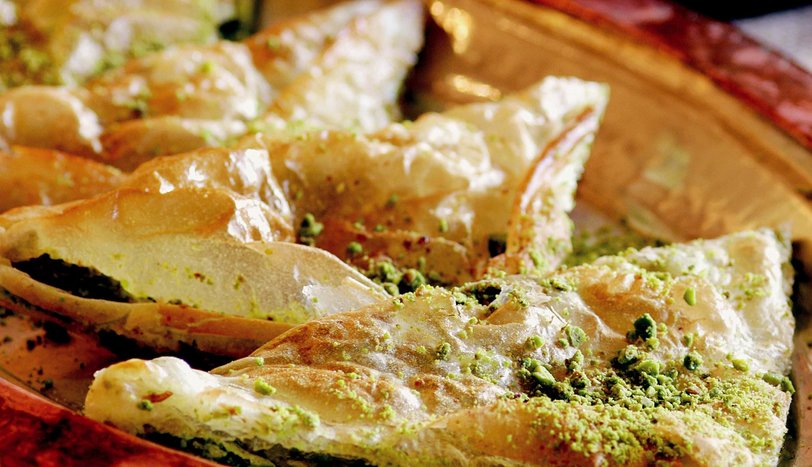 Yufkanın tüm yüzeyine bir miktar tereyağı sürün ve kare olacak şekilde kenarlarını içe doğru katlayın. Üzerine bir miktar kaymak koyun. Şeker ve fıstık serpin. Tekrar kenarlarından kare olacak şekilde katlayın.