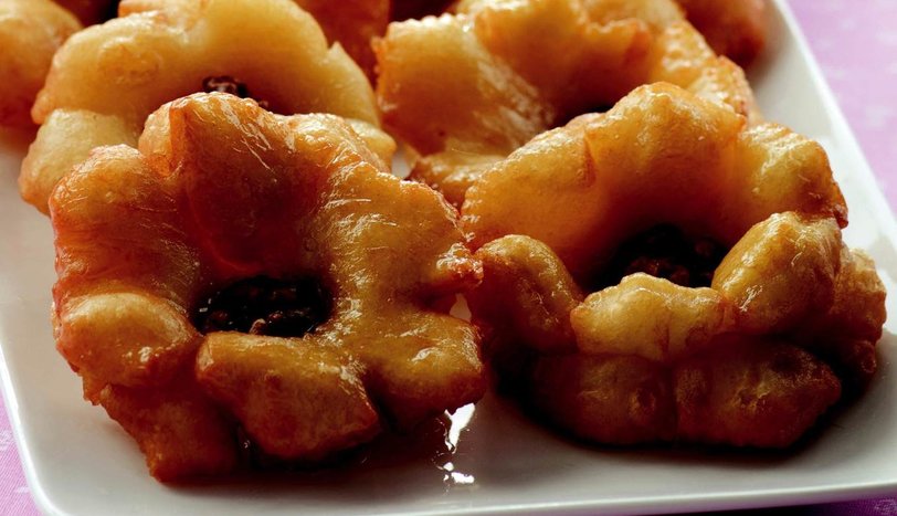 Hamuru bezelere ayırıp, çay tabağı büyüklüğünde açın. Harç için ceviz, üzüm, kayısı, portakal kabuğu, toz şeker ve tarçını karıştırın. Harcı hamurların ortalarına pay edin. Hamurların kenarlarına 1 cm uzunluğunda, 5 adet çizik atıp, yukarıya doğru toplayın. Açılmaması için elinizle sıkın. Üstten sarkan parçalara çırpılmış yumurta sarısı sürün.