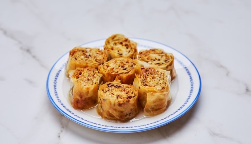 Aynı işlemi 5 adet baklava yufkası için hazırlayıp üst üste yerleştirin. Son yufkaları önünüzden başlayarak ileriye doğru mümkün olduğunca sıkı bir şekilde rulo sarın.