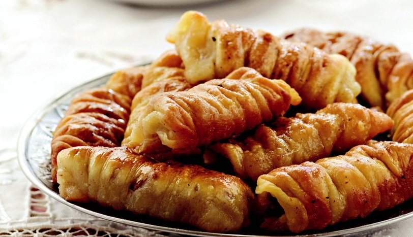 Nişasta serperek, oklava ile çok ince şekilde ve yufka büyüklüğünde açın. Üzerine ceviz serpin ve oklavaya sarın. Yufkayı iki tarafından büzün ve oklavadan çıkarıp, yağlanmış tepsiye yerleştirin. Diğer yufkaları da aynı şekilde hazırlayın ve tepsiye yerleştirin. Üzerine eritilmiş tereyağı veya margarini gezdirin.