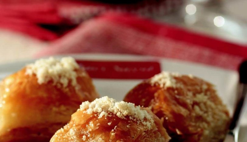 Daha sonra düz bir zeminde her bezeyi üzerine nişasta serperek, tepsinin büyüklüğünde incecik açın. Açtığınız yufkaları üst üste yerleştirin. Yufkaların üzerine fırın tepsisini ters olarak koyun ve kenarlardan taşan kısımları bıçakla kesin. Tepsiyi hafifçe yağlayın ve ilk yufkayı oklavaya sarıp, tepsiye yerleştirin. Artan yufka parçalarını elinizle didikleyip, tepsiye serdiğiniz ilk yufkanın üzerine yayın. Yufkaların yarısını aralarına fırça ile yağ sürerek, tepsiye dizin. İnce kıyılmış fındığı üzerine serpin ve kalan yufkaların da aralarına yine fırça ile yağ sürerek, üst üste dizin. Tepsiye döşediğiniz bütün yufkaların kenarlarını bıçağın tersi ile içeri doğru sıkıştırın. Keskin bir bıçakla kare dilimler kesin. Üzerine kalan tereyağını gezdirin. Fazla yağı tepsiyi hafifçe eğerek, boşaltın. Önceden ısıtılmış 160 derece fırında yaklaşık 40 dakika pişirin.