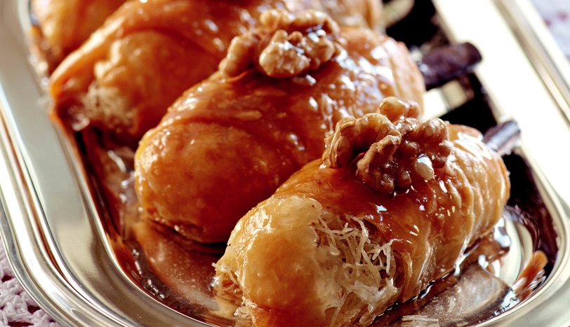 Diğer taraftan kadayıfı eritilmiş tereyağı ile iyice ovarak didikleyin. Üçgen yufkalardan birinin geniş kısmına, biraz tel kadayıf, 1 tatlı kaşığı ceviz ve 1 adet çubuk tarçın koyup, sigara böreği şeklinde sarın. Diğer üçgen yufka parçalarını da aynı şekilde hazırlayın. Önceden ısıtılmış 180 derece fırında üzerleri pembeleşene kadar pişirin. Ilık tatlının üzerine soğuk şerbeti gezdirin.