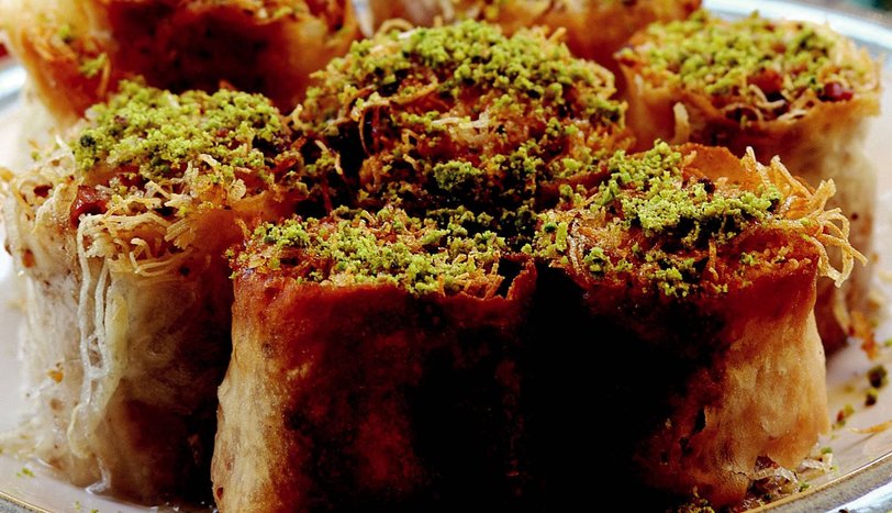 Kadayıfı elinizle didikleyin. Her bir yufkanın üzerini kaplayacak şekilde kadayıf serpin. Üzerine dövülmüş ceviz içi serpin. Kenarları içe doğru hafifçe toplayın. Sonra sıkıca sararak rulo şekline getirin (ruloları sıkı sarmaya özen gösterin ki kestikten sonra dilimler açılmasın).Ruloları iki parmak kalınlığında kesip yağlanmış fırın tepsisine dizin. Üzerine tereyağı parçaları koyup önceden ısıtılmış 170 derece fırında, pembeleşinceye kadar pişirin. Tatlı sıcakken üzerine soğuk şerbeti dökün. Toz antep fıstığı ile süsleyip servis yapın. - 2