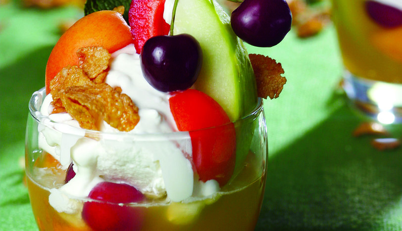 Bardakların üçte birini karışık meyve suyu ile doldurun. Kavunu büyük dilimler halinde, kayısıları ve kivileri ise küçük parçalar halinde kesip bardağın içine yerleştirin. Kiraz ve çilekleri bütün olarak bardağa koyun. Kremşantiyi de sütle çırparak bardaklara ekleyin. Taze nane yaprakları ile süsleyerek servis yapın.