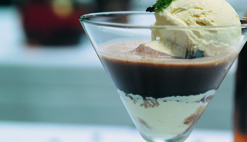 Dondurma hariç bütün malzemeyi blendıra alın. Karıştırarak sos kıvamına getirin. Martini bardağına 1 top dondurmayı alın. Üzerine hazırlanan sosu dökün. Üzerine 1 top vanilyalı dondurma yerleştirip kaşık ile servis yapın.
