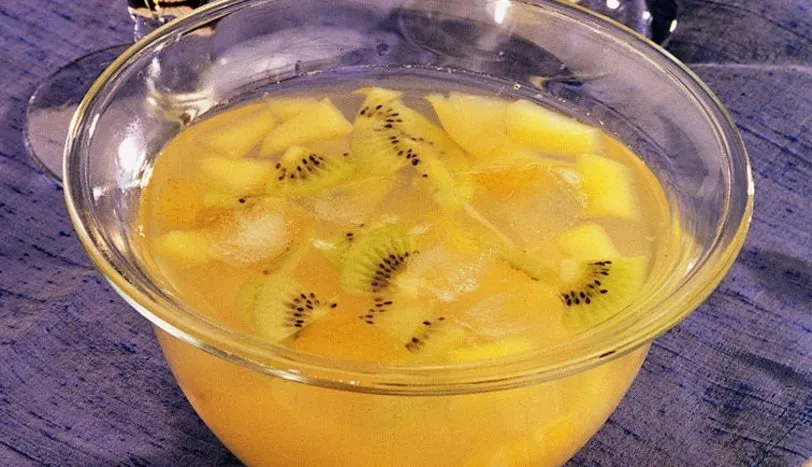 Suyu, toz şeker ile bir tencereye alın ve ocağa oturtun. Elma, armut ve muzu soyup, küçük parçalar halinde kesin. Kararmamaları için üzerlerine limonun suyunu gezdirin. Portakalı da küçük küçük dilimleyin. Şekerli su kaynamaya başlayınca meyveleri suya atın ve 10 dakika kaynatın. Meyveler yumuşayınca ocağı kapatın. Hafif soğumaya başladıktan sonra kivileri soyup, dilimleyin ve diğerlerine ekleyin. Soğutup, servis yapın.