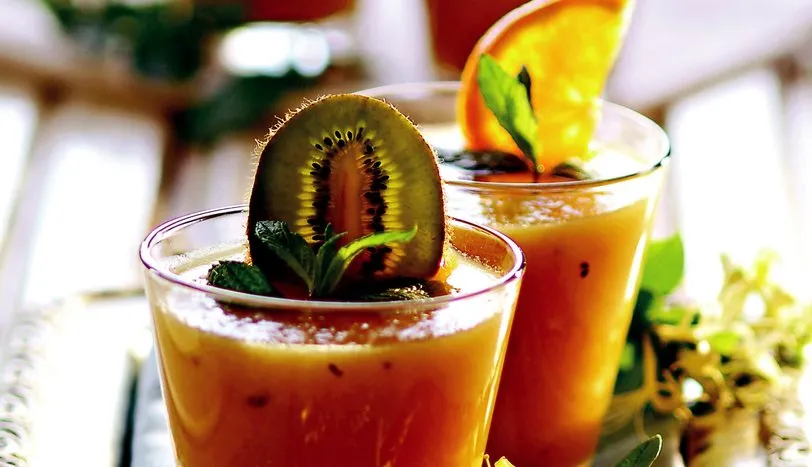 Şeftali, ananas ve kiviyi temizleyip ayrı ayrı katı meyve sıkacağından geçirin. Sularını kenara alın. Elmanınçekirdek yataklarını çıkarıp, katı meyve sıkacağından geçirin. Kavunun kabuğunu alıp onu da katı meyve sıkacağından geçirin. Portakalın suyunu sıkın. Tüm meyve suların ı bir sürahide karıştırıp, buzdolabında soğutun. Bardaklara paylaştırın. Nane yaprakları, kivi ve portakal dilimleri ile süsleyerek servis yapın.