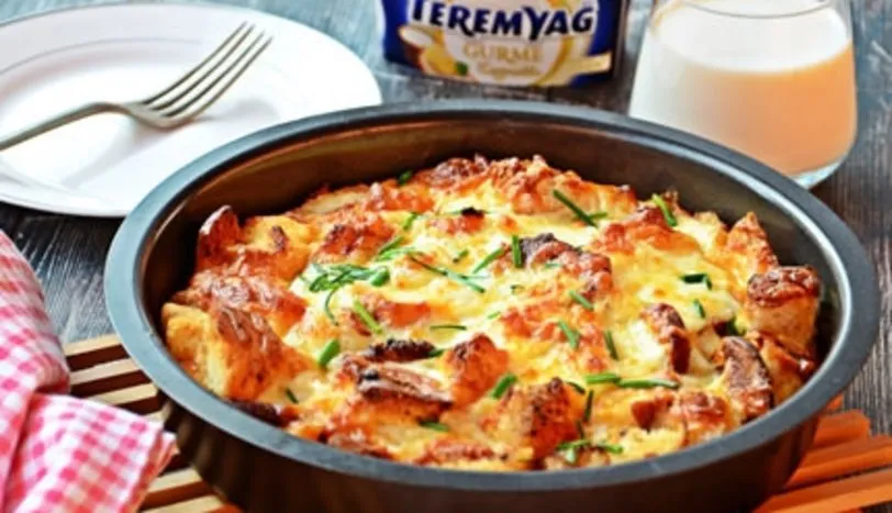 Tavada Teremyağ Gurme Kaymaklı'yı eritip, soğanları kavurun. İçine bayat ekmekleri ekleyip nar gibi olana dek kavurmaya devam edin. Üzerine sucuk dilimlerini ekleyerek 1-2 dakika daha kavurun. Altını kapatıp, fırına dayanıklı bir kaba alın. Süt, yumurta, kaşar peyniri, tuz ve karabiberi çırpıp üzerine dökün. 175 derece fırında 10 dk kadar pişirin. Daha sonra üzerine kaşar peynirlerini ekleyip 5 dk daha fırında tutup sıcak olarak servis yapın.