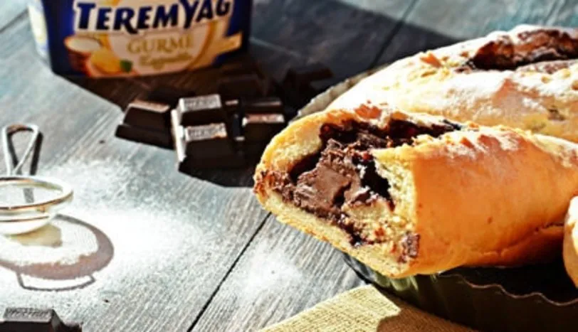 Hamuru için gerekli olan tüm malzemeleri yoğurup, 2 katı büyüklüğe ulaşıncaya kadar dinlendirin. Dinlenen hamuru 3 eşit parçaya ayırıp elinizle inceltin. Aralarına kakaolu fındık ezmesini paylaştırıp, hamuru ortada birleştirin. Ek yeri alta gelecek şekilde fırın tepsisine yerleştirip, ortasına bıçakla derin olmayan bir çizik atın. Son olarak üzerine fırça ile su sürüp 200 derecede önceden ısınmış fırında pişmeye bırakın. Üzeri kızardıktan sonra fırından alıp sıcak veya soğuk olarak dilimleyerek servis yapın.