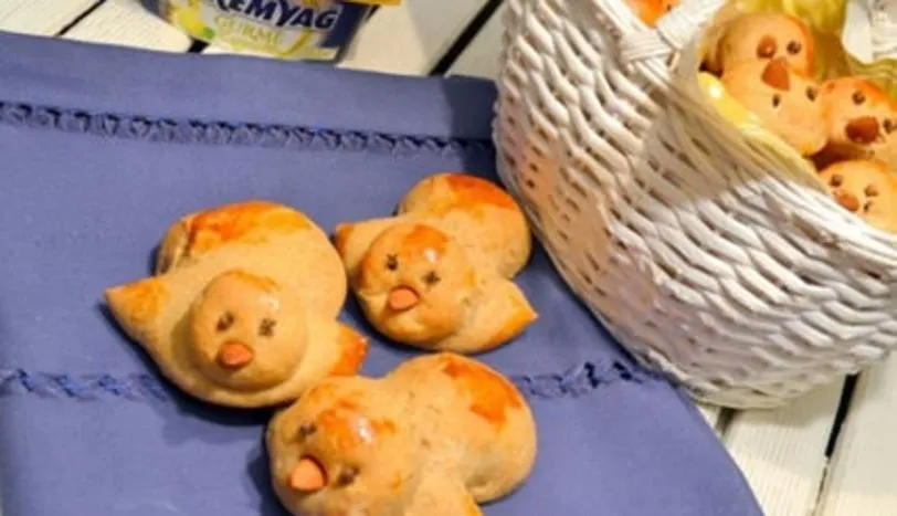 Hamuru için gerekli malzemelerin hepsiyle yumuşak bir hamur hazırlayın ve hamur iki katı büyüklüğe çıkıncaya kadar dinlendirin. Dinlenen hamurdan 10 adet limon büyüklüğünde 10 adet de ceviz büyüklüğünde bezeler yapıp yuvarlayın. Limon büyüklüğündeki bezelere oval şeklini verip kuşun kuyruk olacak kısmını biraz uzatın. İki yanına bir bıçak veya makas yardımıyla verev çentikler yapıp kanat şekli verin. Ceviz büyüklüğündeki bezeleri de kafa olacak şekilde yerleştirip bademlerle gaga, karanfillerle göz yapın. Üzerine yumurta sarısı sürün ve 180 derece fırında üzeri kızarana kadar pişirip servis yapın.
